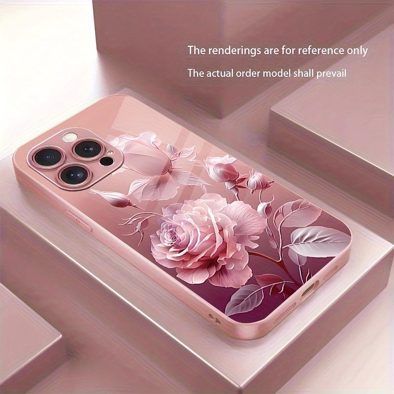 Luxury Pink Rose Pattern Pink Metallic Paint Glass Hard Phone Case For iPhone 17 16 15 14 13 12 11 Pro Max Plus 16E 17Air Cover