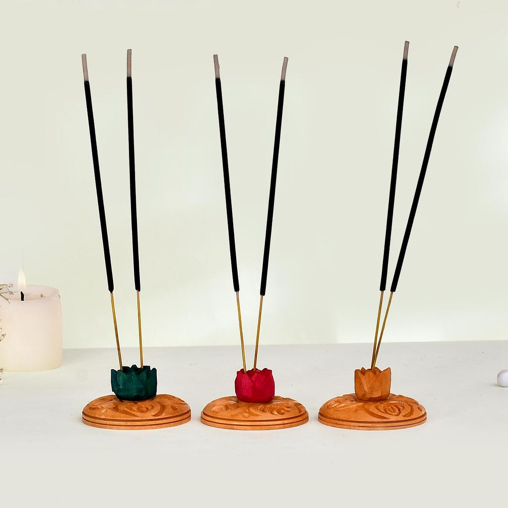 The stand securely holds incense sticks upright while the wooden base helps collect ash, keeping your prayer or meditation area clean. Its compact size makes it ideal for home temples, meditation rooms, yoga spaces, offices, and gifting purposes.