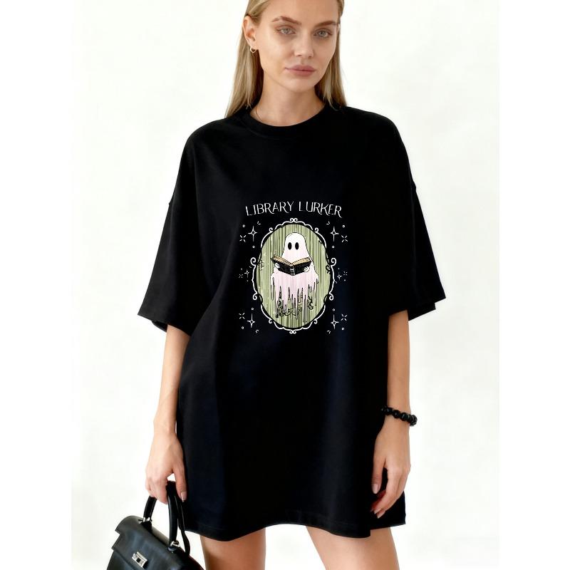 Oversized T Shirt Black Library Lurker Ghost Reading Book Graphic Print Casual Wear For Women And Girls