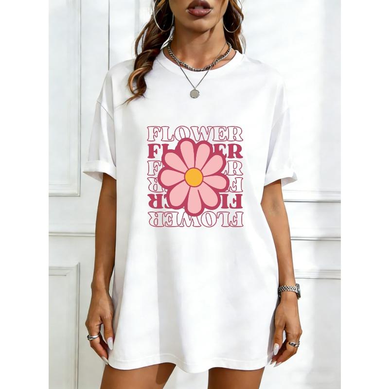 Oversized T Shirt Black Flower Print With Pink Daisy And Text Flower For Casual Wear