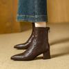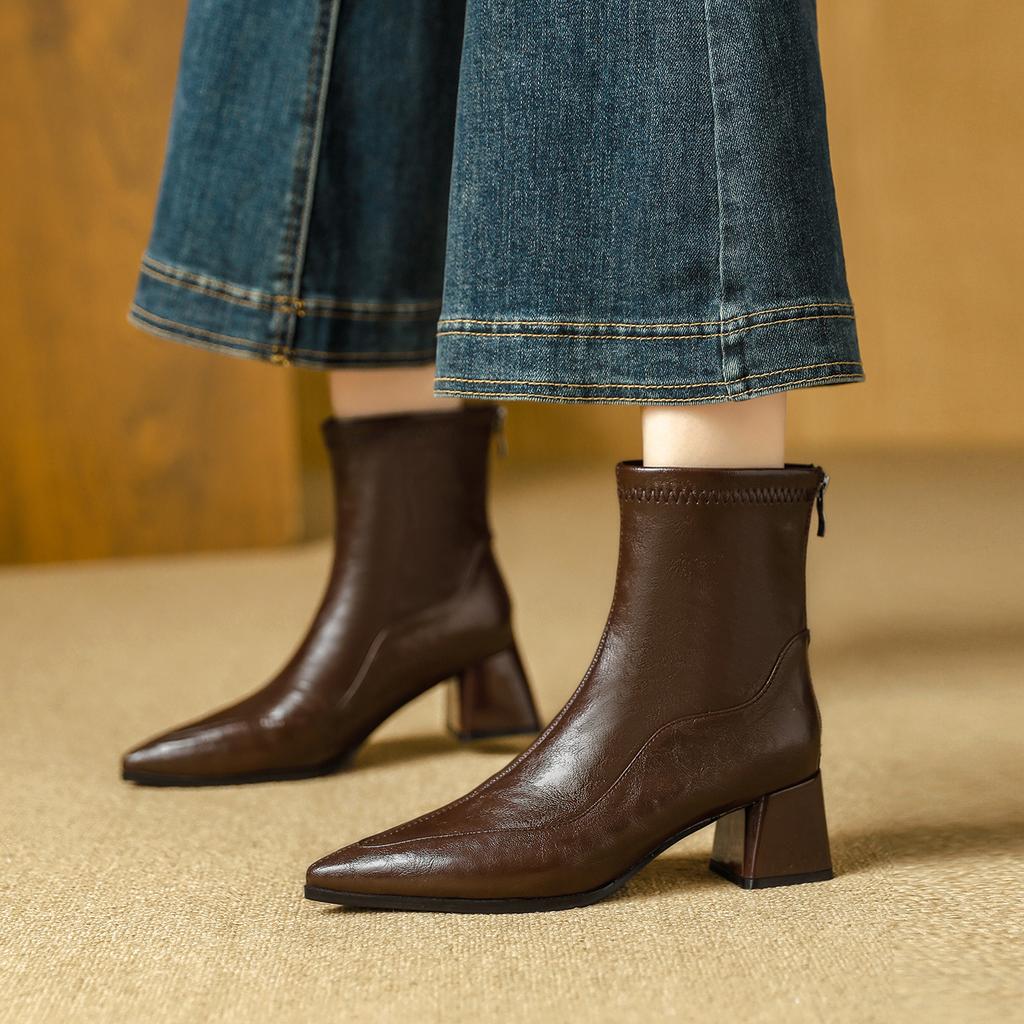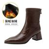 High Heel Short Boots Coarse Heel Pointed Skinny Boots Brown Fleece Winter Boots Medium Boots