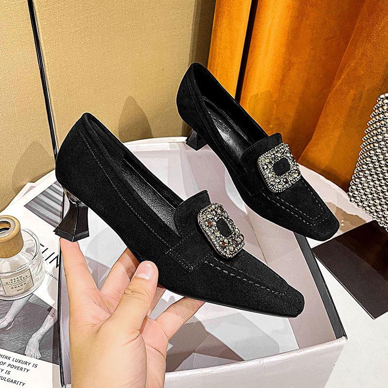Black High Heels Thin Heel Autumn and Winter Rhinestone Square Buckle French Square Head Single Shoes British Middle Heel Shoes