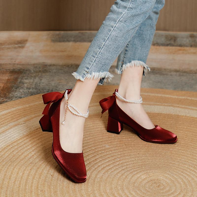 Square Head High Heels Thick Heel Mary Jane Shoes Red Wedding Shoes High Sense Pearl Medium Heel Single Shoes