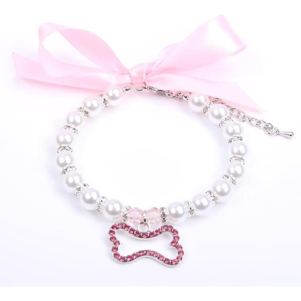 Dog Cat Pearls Necklace Collar with Rhinestones Bone Charm Pendant Pet Puppy Jewelry Accessory (Pink, Small)