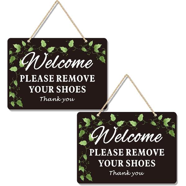 2 Pack Please Remove Your Shoes Front Door Signs - Aluminum Welcome Take Off Your Shoe Sign for Home with Hanging Rope - No Shoe Signs for House