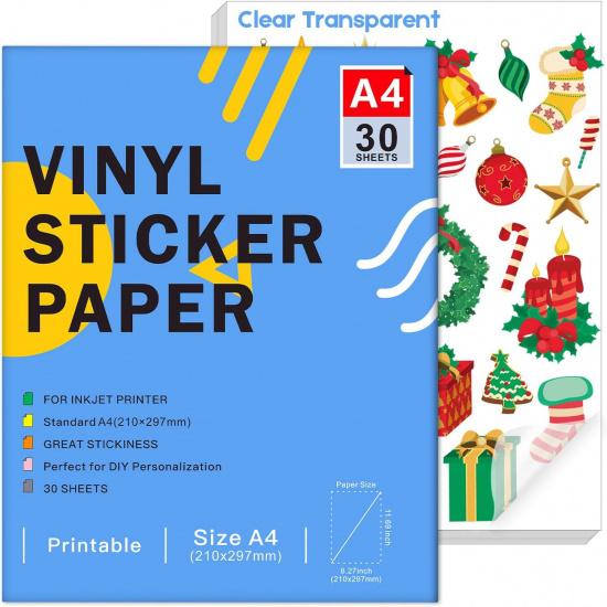 【A4 Sticker Paper for Printing】: The Package Contains 30 Sheets of Transparent Printable Vinyl Sticker Paper,The specification is A4 size: 11.69 x 8.26 inches (297 x 210 mm), and it is suitable for most inkjet printers