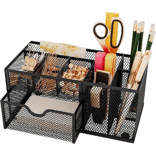 Mesh Pen Holder for Desk 8 Compartment Desk Organizer for Pens Pencils Sticky Notes Clips Office Accessories