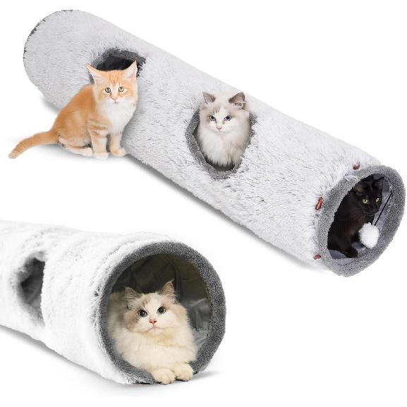 Cat Tunnel Collapsible Long Plush – Cat Crinkle Tunnel – Cat Tunnel for Indoor Cats – Cat Tube Cute Cozy Pet Play for Hours of Fun (47" / Pearl