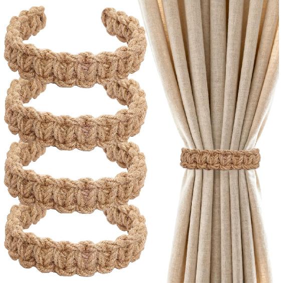 4pcs Braided Curtain Tiebacks Boho Curtain Holdbacks Farmhouse Tie Backs Holders for Home Bedroom Office Drapes Curta (Linen)