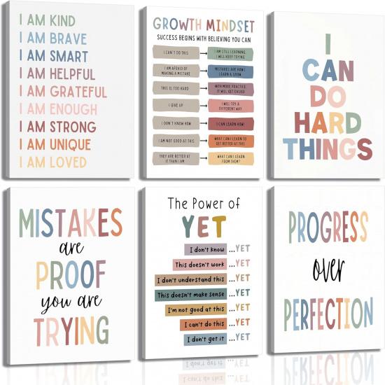 6Pcs Educational Growth Mindset Wall Art Kids Mental Health Therapy Canvas Paintings Positive Affirmations Wall Decor Boho Motivational Quotes