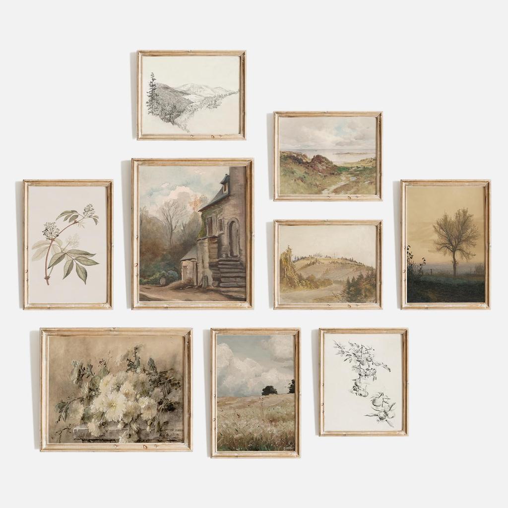 TheCanvas Vintage Wall Art Prints Set of 9, Eclectic Nature Wall Art for Living Room, French Country Landscape Painting, Gallery Wall Decor for