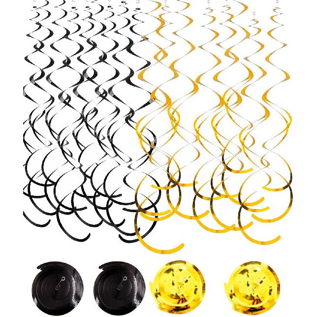 30Pc Gold and Black Party Party Swirl Decorations Foil Swirl Hanging Decoration Plastic Streamer for Ceiling 22 In
