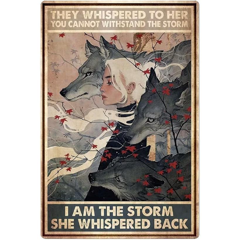 Wolf Metal Tin Sign I Am The Storm She Whispered Back Funny Poster Cafe Living Room Kitchen Bathroom Home Art Wall Decor Plaque