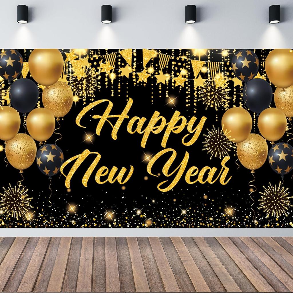 Black Gold Happy New Year 2026 Banner, Large New Years Eve Banner, NYE Birthday Party Decorations Background for Friend, Family, Indoor, Outdoor,