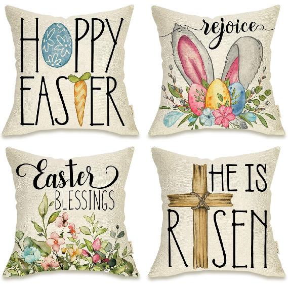 Fahrendom Happy Easter Eggs Bunny Decorative Throw Pillow Cover 18x18 Set of 4, Religious Rejoice Rabbits Carrot Flower Blessings Outdoor Pillowcase,