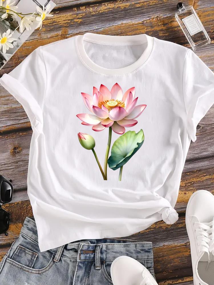 (Asian Size) Lady Female Top Printed Women Flower Sweet Trend 90s Casual T Shirt Fashion Graphic Short Sleeve T-shirts Tee Clothing