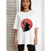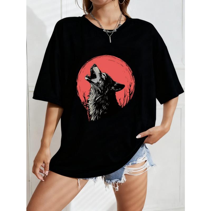 Wolf Howling Graphic T Shirt White Wolf And Red Moon Print Casual Summer Wear For Women