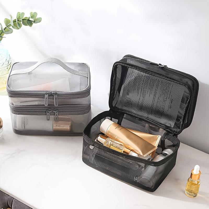 Double-Layer Makeup Bag - Large Capacity, Portable Cosmetic Organizer with Mesh Design for Travel & Bathroom Storage Bags