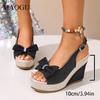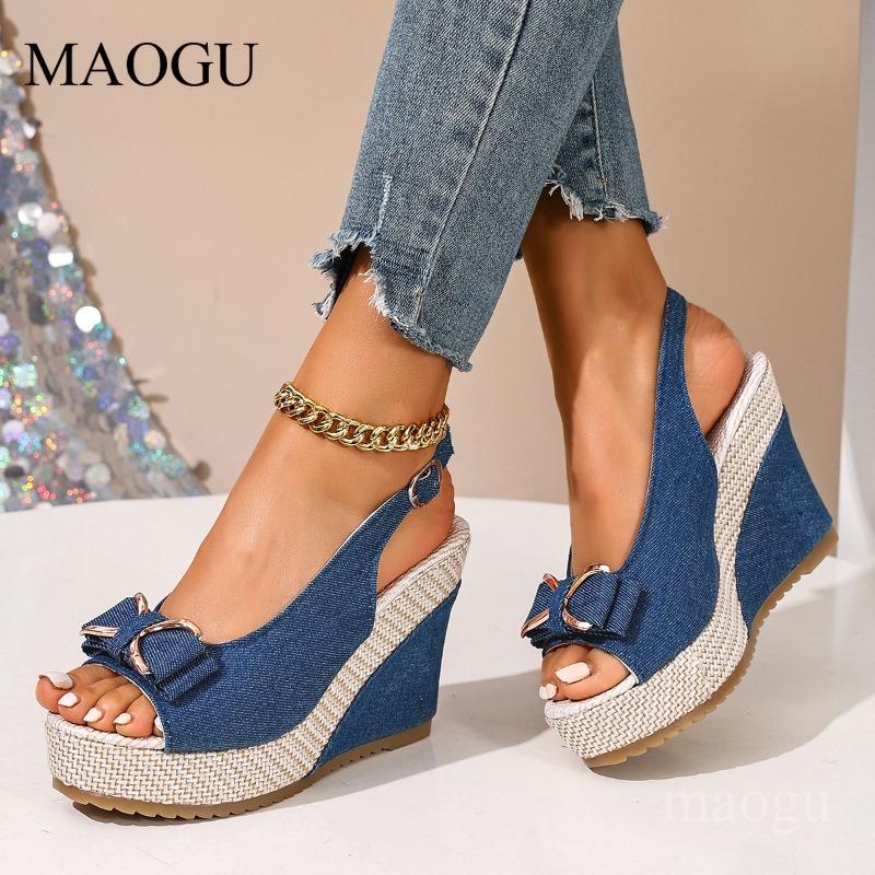 Peep Toe Bow-Knot Slingback Sandals Espadrille Platform Wedges Breathable Denim Sandals Ankle Strap Casual Summer Shoes Woman