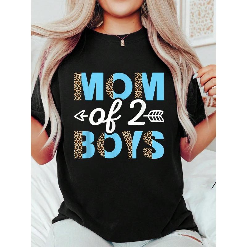 European Size Mom of 2 Graphic T-Shirt - Playful Lettering with Leopard Print Accents, Soft Round Neck Casual Summer Tee for Women, Mother's Day Gift