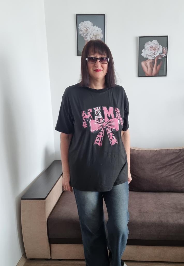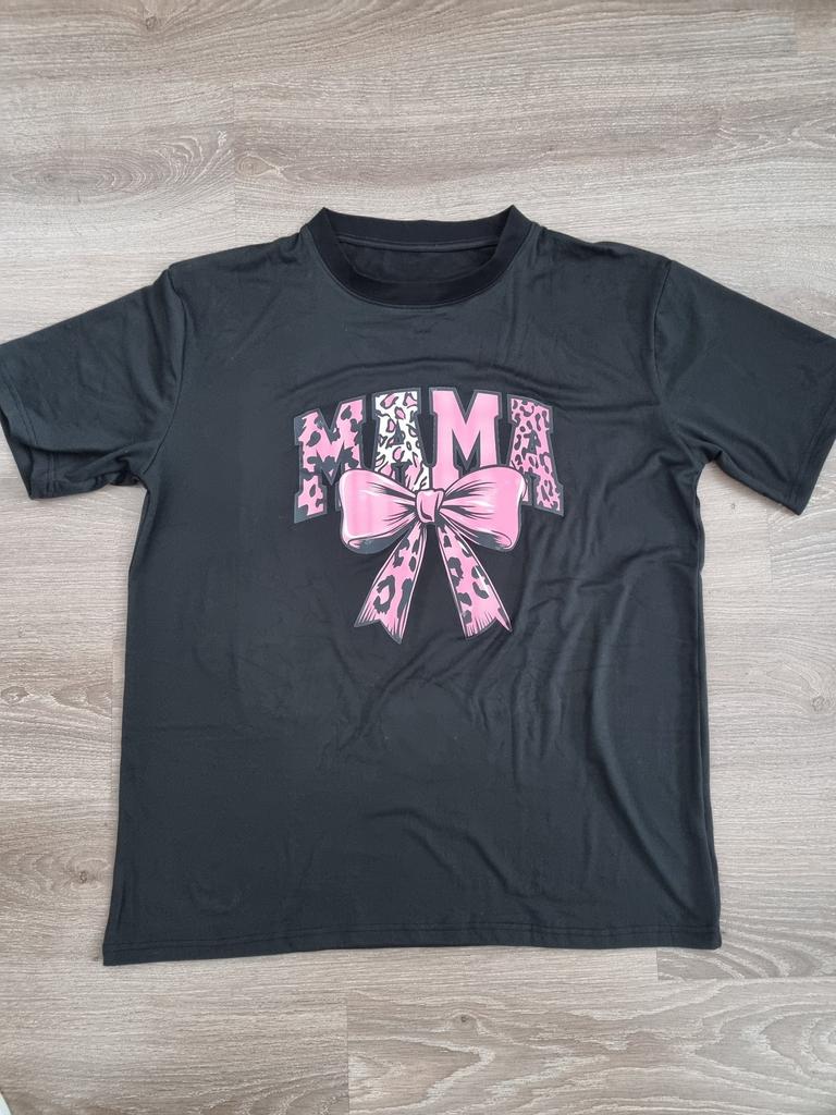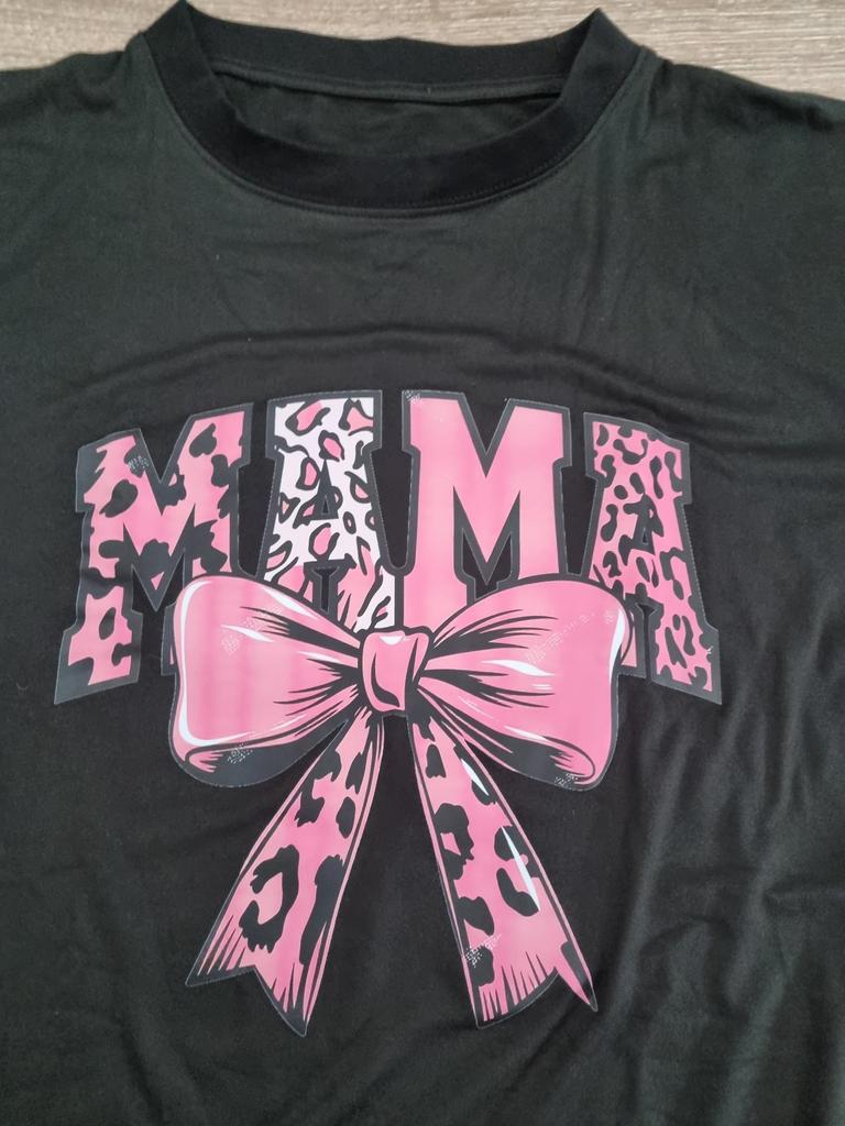 European Size Women's Plus Size Graphic T-Shirt Soft Stretch Crew Neck Tee with MAMA Bow Design In Black & Pink Leopard Print Casual Everyday