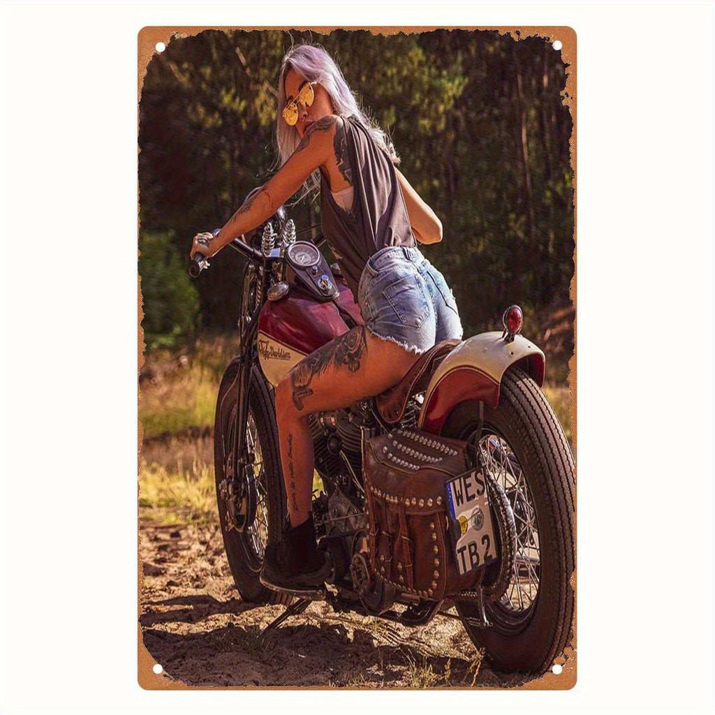 Vintage Motorcycle Goddess Metal Sign Featuring a Vivid Red and Stylish Rider Perfect for Cafe Bar Garage