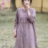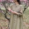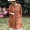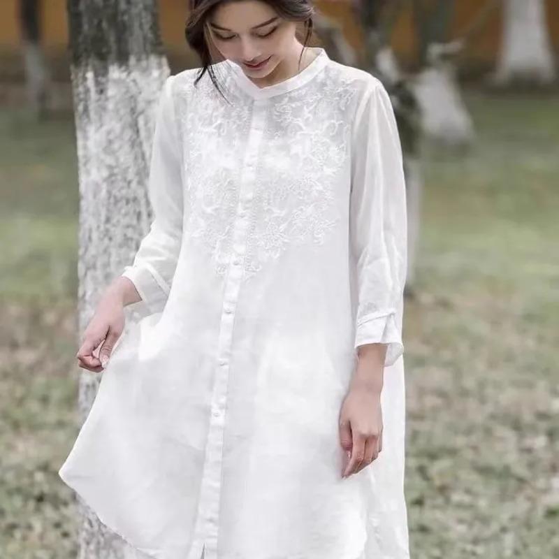 Women's Khaki Embroidery Long Sleeve Blouse Round Neck Button Front High-Low Hem Loose Casual Elegant Top