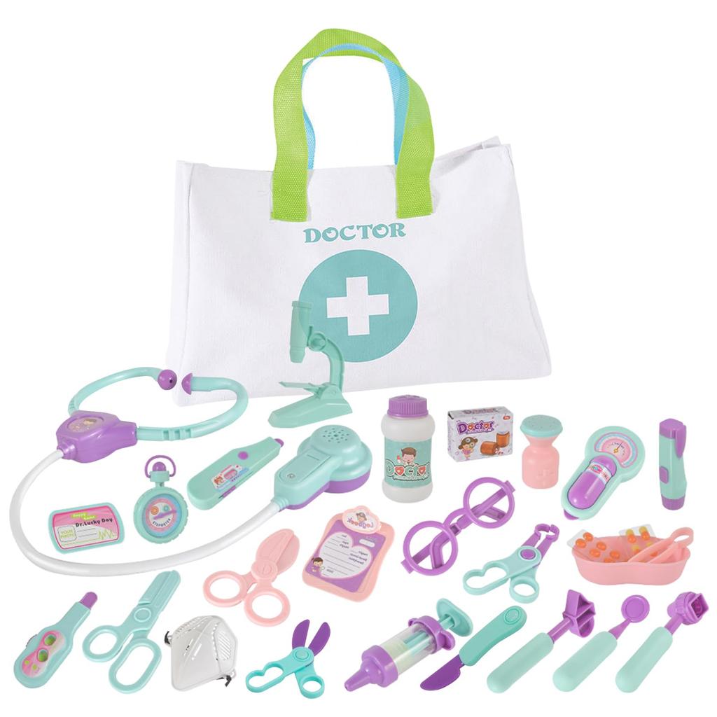 👩⚕️【Luxurious Doctor Play Set】This doctor toy set includes a total of 28 items, including a stethoscope🩺, syringe💉, glasses👓, thermometer🤒, cuffs💊, scissors✂️, forceps, medical chart, microscope🔬, mask😷, scalpel🔪, clips, flashlight🔦, and storage bag🛍️.