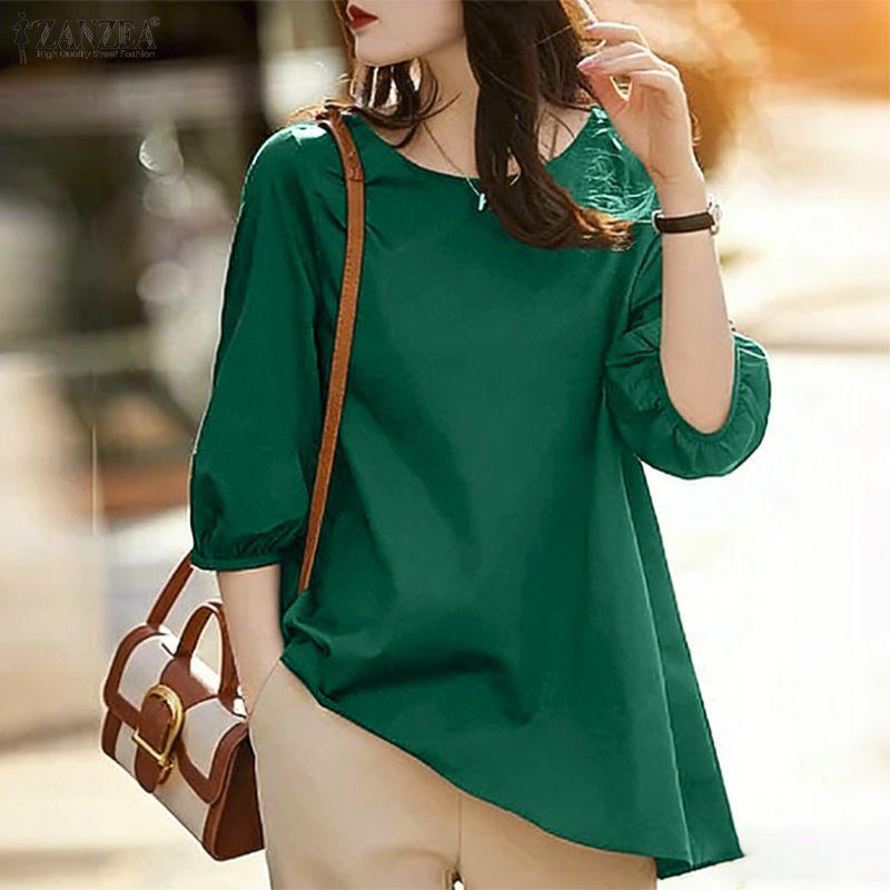 ZANZEA Women Casual Round Neck 3/4 Sleeve Loose Irregular Blouse