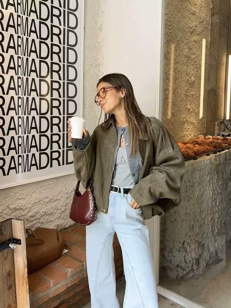 Women's Spring Autumn Faux Suede Lambskin Collar Zip-Up Pilot Jacket Coat