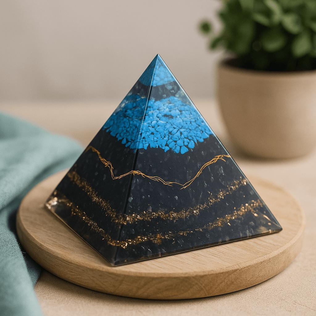 Crafted as a mindful object, this orgone energy cone is inspired by the philosophy that balanced layers can help harmonize space and intention. In this view, resin holds and clarifies, metals represent movement and circulation, and crystals are kept as steady points of focus. Here, turquoise is often associated with calm communication and open-hearted clarity, while black tourmaline is traditionally valued as a symbol of steadiness and boundary. Together, the materials offer a quiet visual rhythm that many people welcome in meditation areas, desks, or living spaces. 🧘