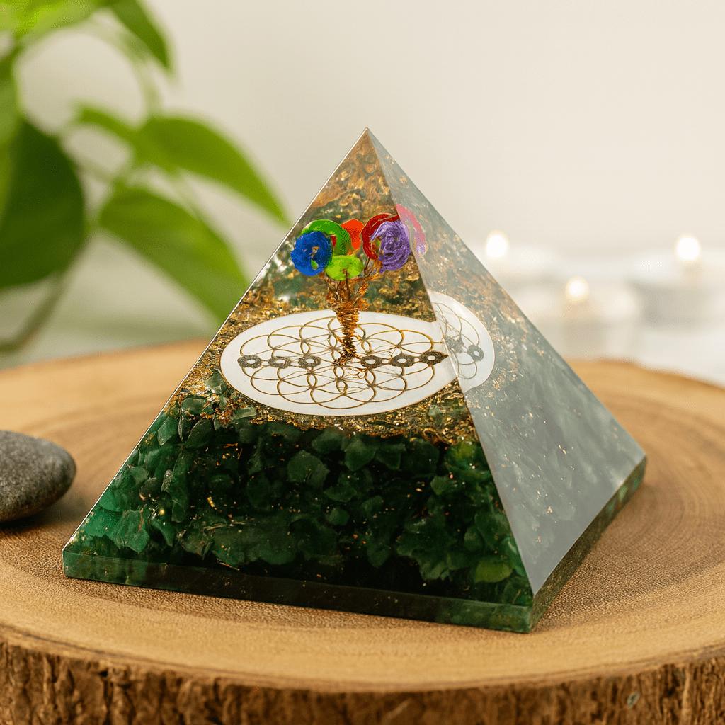 Rooted in the philosophy of orgone energy, this form brings together resin, metals, and crystals as a symbolic balance of elements—organic and conductive, stillness and movement—believed to help harmonize environments by balancing subtle energies. Here, green aventurine anchors the base with a soft, earthy presence; fine metallic shavings and copper coils add a luminous, grounding counterpoint; and a delicate Flower of Life motif rests at the heart, inviting a steady gaze.