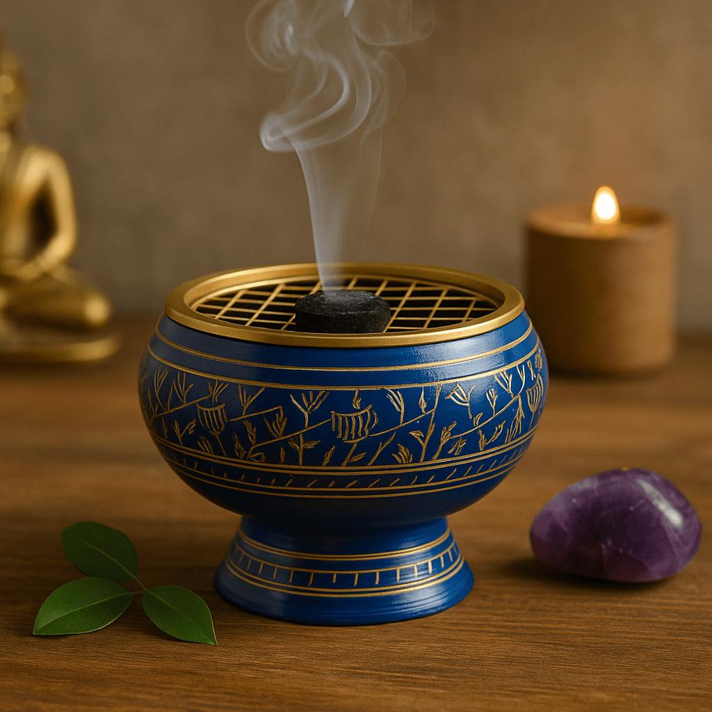 Once a light ash forms, add a small pinch of resin or incense blend and let the aroma unfold in its own time.
