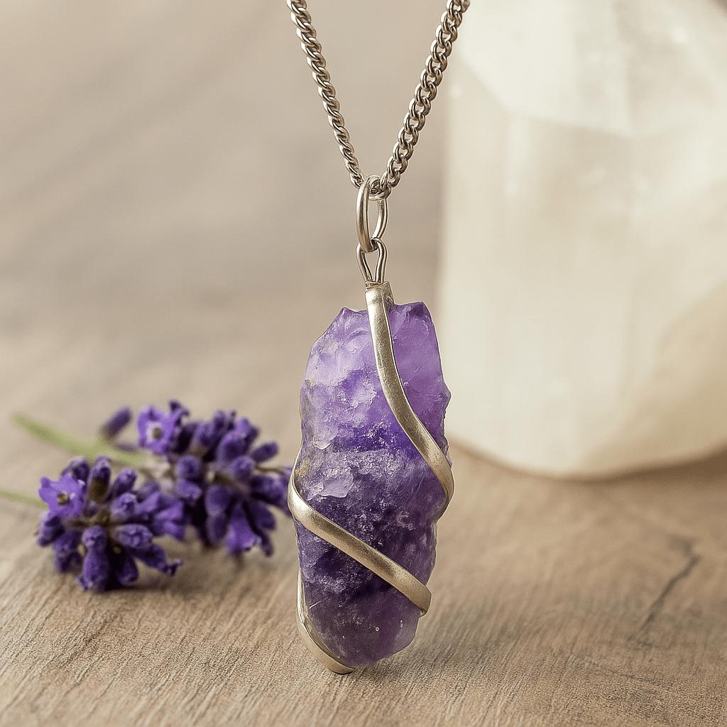 Amethyst, a cherished quartz, has long been associated across cultures with clarity, steadiness, and a contemplative mind — often kept close as a reminder to pause and breathe. In its natural, textured form, the stone feels grounded and real; slight translucency at the edges catches the light with a soft, inner glow. The silver‑tone wrapping and curb‑style chain offer a clean, minimal frame, adding a cool sheen that balances the richness of purple. Together, material and form create a quiet talisman — personal, modern, and attuned to nature’s rhythm. 🌿