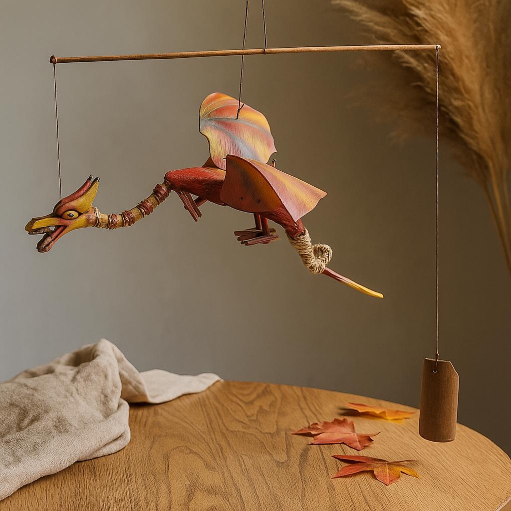 A warm, wooden chime rises as a carved coconut dragon turns in the breeze. Predominantly reddish-brown with a soft sheen, it hangs by fine cords, wings curving like plates as the coiled tail follows. The motion is fluid; the notes are gentle and earthy — a quiet reminder of balance, presence, and the unseen currents moving through your space. 🌬️