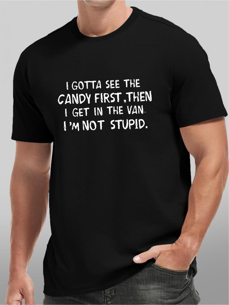 Mens Fun I Have To Look At Candy First Printed Tshirt Black and White Lettering Humorous Slogan Casual Crew Neck