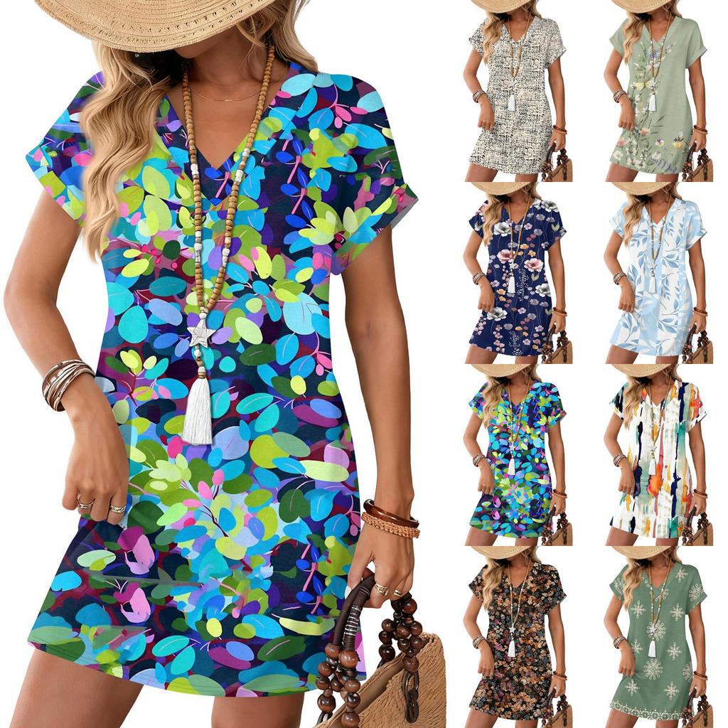 Short Sleeve Women's Dress Casual Dresses With Pockets V Neck Vocation Boho Beach Sundress