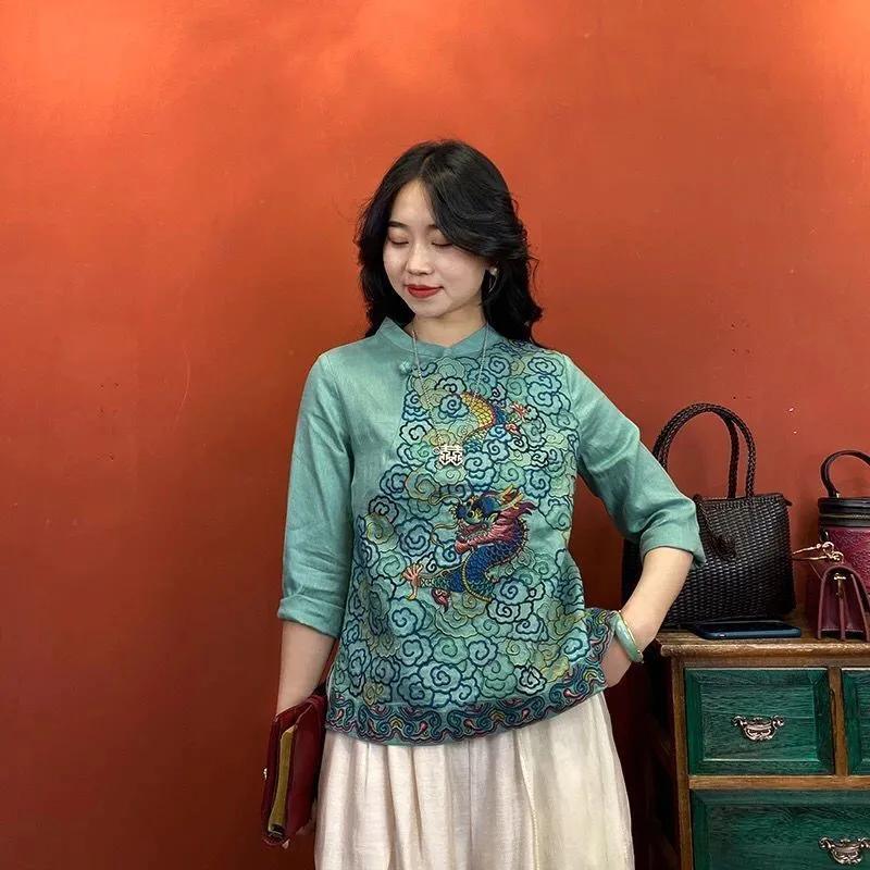 Women's Teal Linen Blouse 3/4 Sleeve Mandarin Collar Dragon Embroidery Chinese Style Top