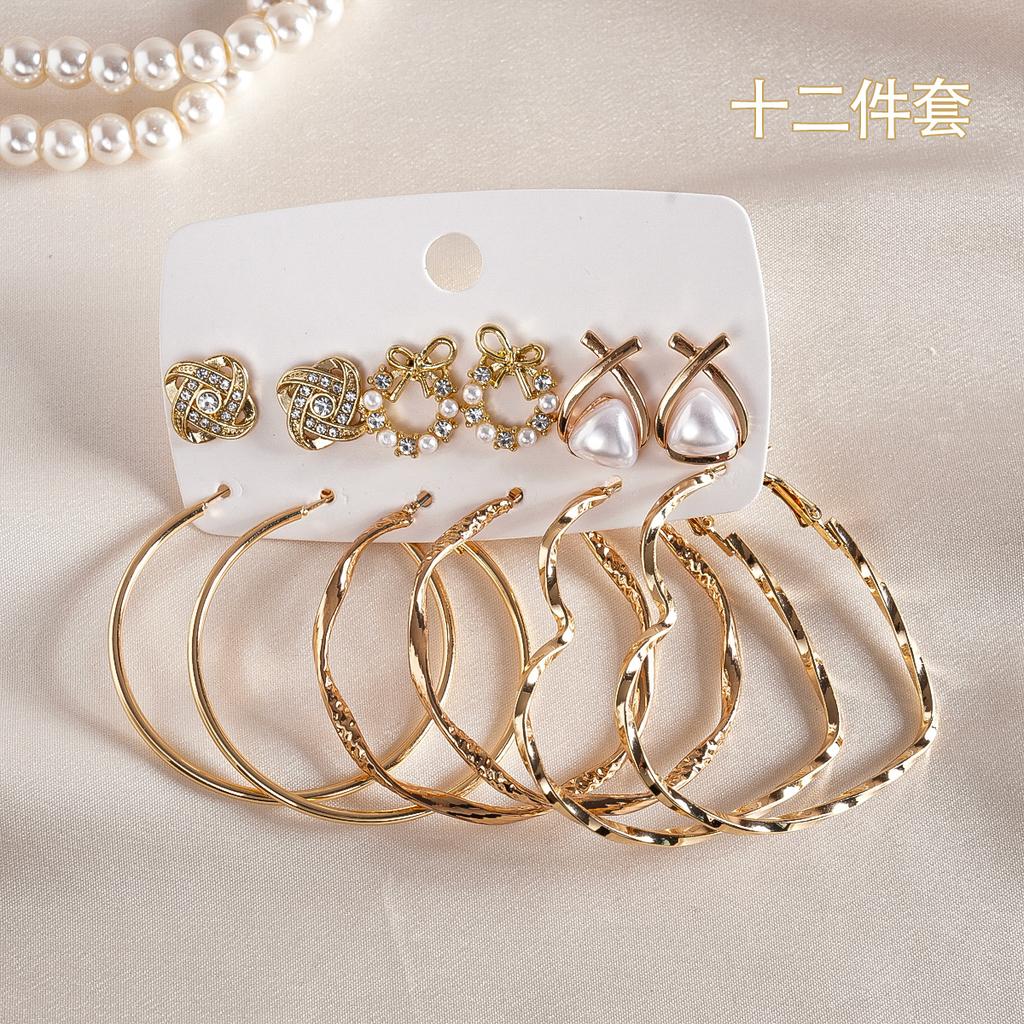 Twelve-piece Set of Diamond-set Imitation Pearl Geometric Round Love Cross Silver Needle Earrings Light Luxury Earrings