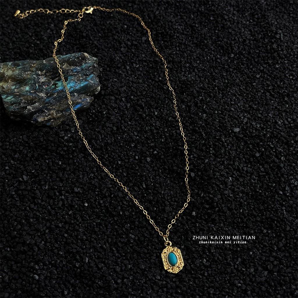 Thick-plated 18K Real Gold Strong Color Retention Synthetic Turquoise Geometric Literary and Retro Commuting Necklace, Collarbone Chain