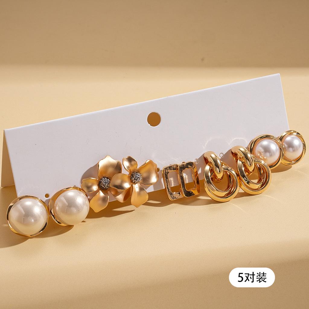 Ten-piece Set of Imitation Pearl Flower Round Square Silver Needle Stud Earrings Elegant Niche Earrings