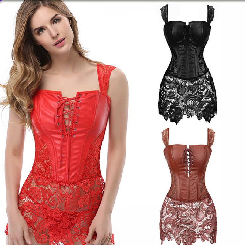Women's Gothic Faux Leather Bustier Overbust Corset Lace Skirt Fancy Dresses Costume Plus Size