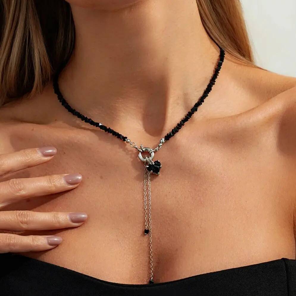 Salircon Vintage Black Heart Crystal Pendant Necklace Women Luxury Irregular Geometric Tassel Chain Choker Trendy Jewelry Gifts