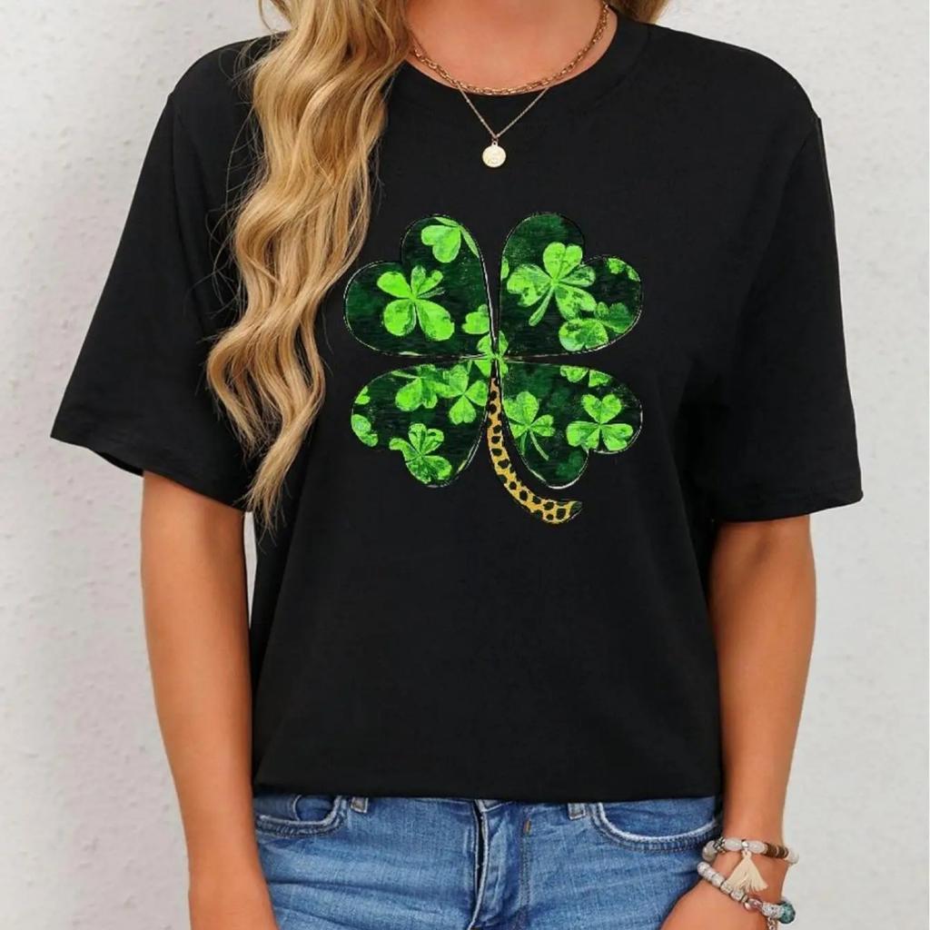 Women's Casual Crew Neck T-Shirt, 95% Polyester 5% Spandex Knit Fabric, All-Season Leopard Print Four-Leaf Clover Graphic Tee Fo