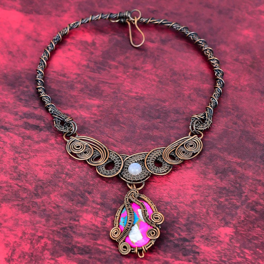 Cotton Candy Turquoise Necklace Copper Wire Wrapped Necklace Rainbow Moonstone Gemstone Jewelry Handmade Necklace Copper Jewelry for Gifts