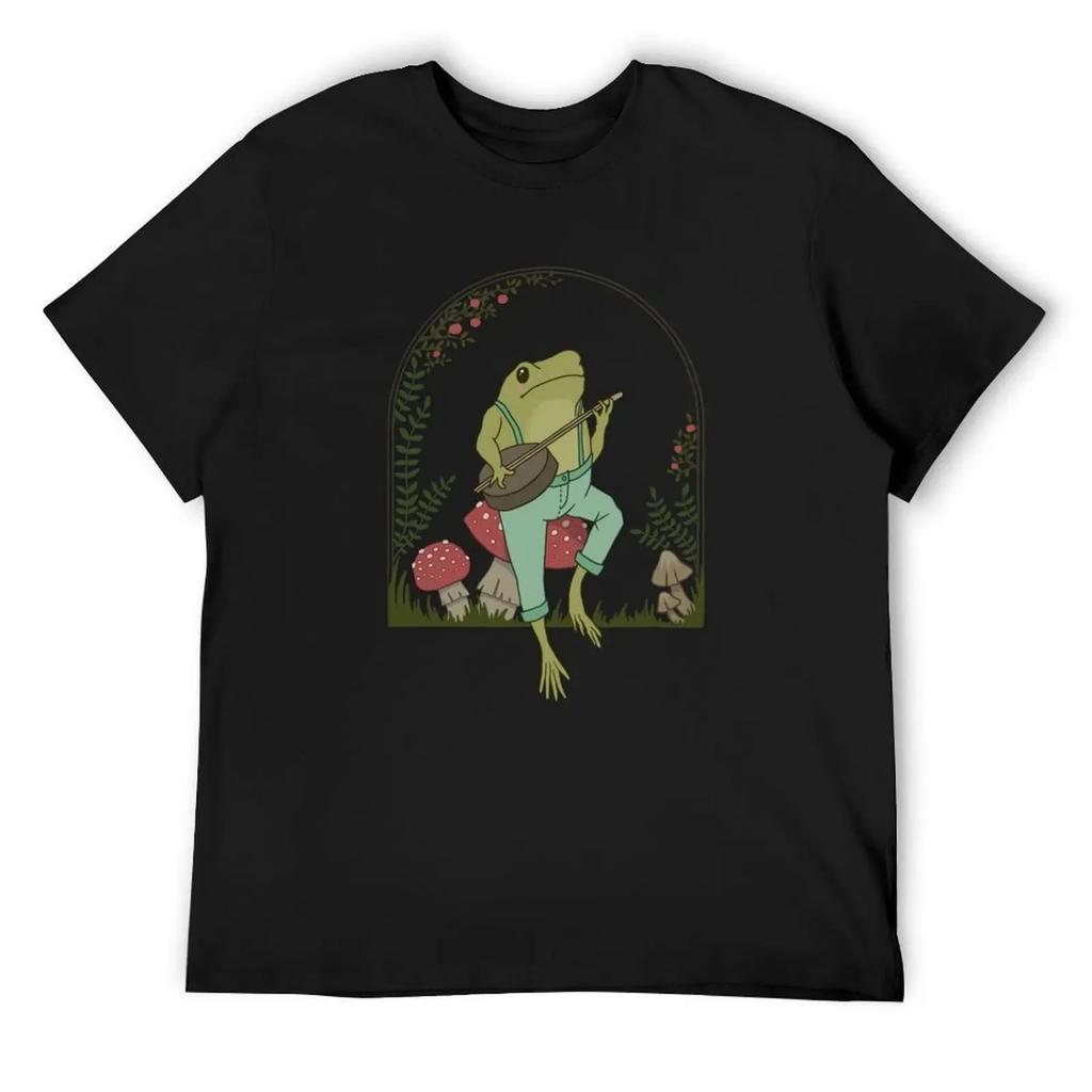 Cottagecore Aesthetic Frog Playing Banjo On Mushroom_ Cute Vintage Goblincore Farmer Toad In Garden, Emo Grunge Fairycor T-Shirt