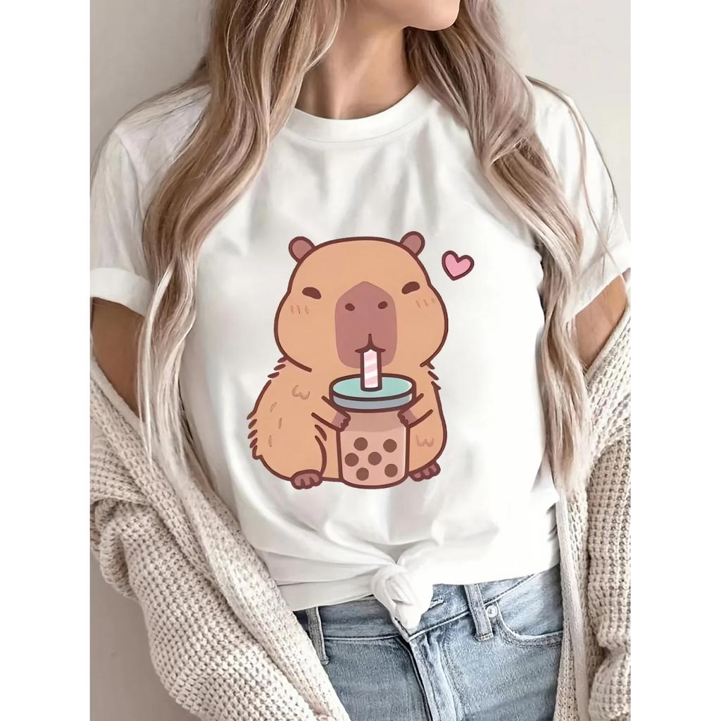 Bubble Tea Graphic Polyester Fabric Machine Washable All-Season Comfort Women's Casual Short Sleeve T-Shirt Capybara Drinking