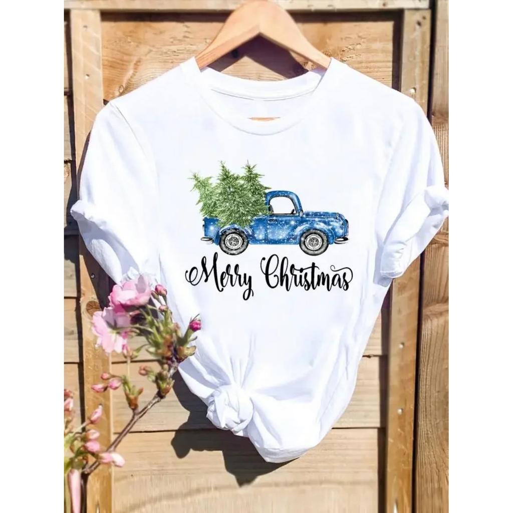 Merry Christmas Tree Truck Watercolor Print T Top Women Holiday Clothing Fashion Female Shirt New Year T-shirts Graphic Tee