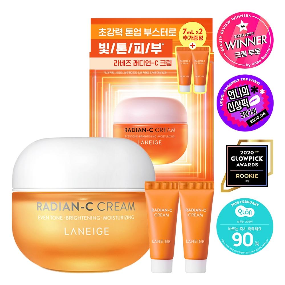 Laneige Radiant C Cream 30ml Set (+7+7ml) is a vitamin cream that helps with skin tone and spot care, designed to cultivate brighter skin with a dual vitamin composition. As a powerful tone-up booster, it restores a luminous complexion in just two weeks, confirming uniformity and brightness in skin tone after use. Clinical test results indicate a 30% improvement in dullness, a 36% improvement in skin transparency, and a 67% strengthening of the skin barrier. Satisfaction regarding skin changes the day after use is 100%, with a 96.6% satisfaction rate for spot improvement. This cream, containing vitamin C derivatives and vitamin E, is low irritant and suitable for sensitive skin.