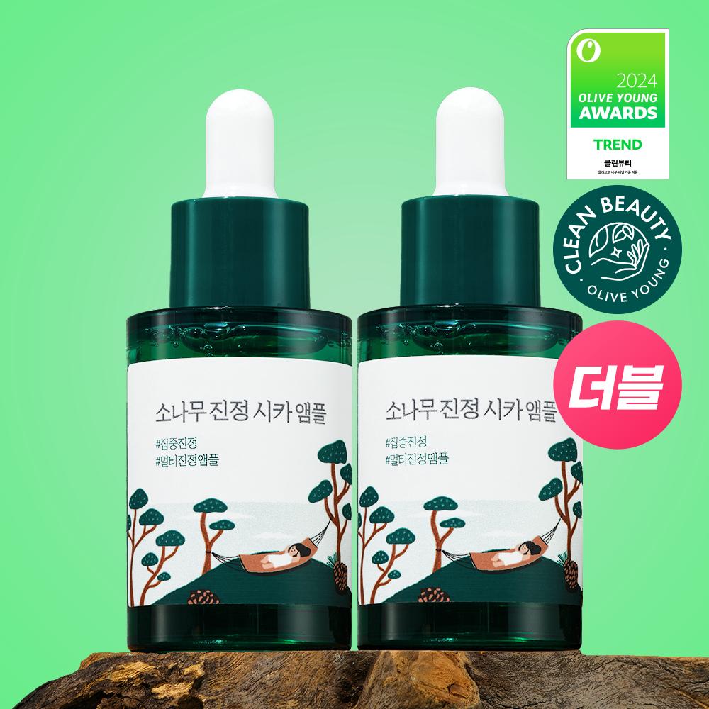 [Double Project] Round Lab Pine Soothing Cica Ampoule 30ml+30ml is a soothing serum derived from the leaves of Yangyang pine, suitable for all skin types. It contains plant-based proteins and five Cica components that immediately provide hydration and soothe the skin. This product can be used in the essence step and boasts excellent absorption due to its high-concentration texture.